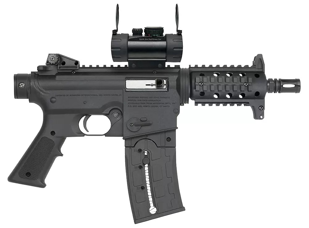 This fun .22 pistol is lightweight, easy to shoot, and perfect for small game, plinking, target shooting, or clearing cottonmouths out of your duck blind. This pistol has a pistol grip stock, vented quad rail forend, and a 6″ blued barrel with an A2-style muzzle brake. This combo comes with a 1x30mm red dot sight, Picatinny rail-mounted adjustable front and rear sights, and a 25-round magazine with an accessory loader.