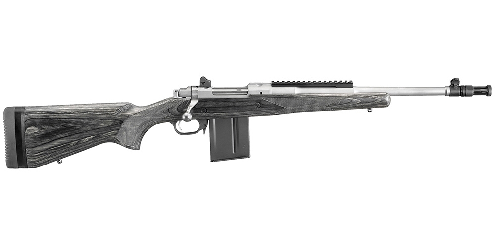 Ruger’s Gunsite Scout Rifle is developed with Gunsite and is “Gunsite Approved” and features the Gunsite name roll marked on the receiver. It has a forward-mounted Picatinny rail which allows for the mounting of modern optics and a built-in, accurate sighting system with ghost ring adjustable rear aperture sight and a non-glare, blade front sight. Patented integral scope mounts are machined directly on the solid-steel receiver which provides a stable mounting surface. The non-rotating, Mauser-type controlled round feed extractor features a fixed blade-type ejector that positively ejects the empty cases as the bolt is moved fully rearward. The Gunsite Scout Rifle also has a free-floated, cold hammer-forged barrel with ultra-precise rifling, three-position safety, sling swivel studs, detachable box magazine with push-forward magazine release, and a soft rubber buttpad with buttpad spacers. Included are scope rings and three .5″ spacers. This model has a 16.1″ stainless steel barrel, black laminate stock, and Gunsite engraved on the grip cap.